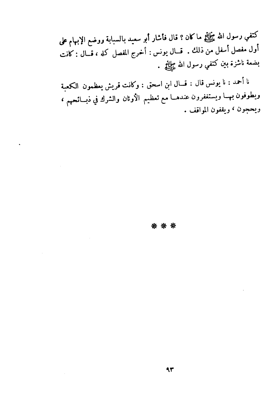 نا أحمد: نا يونس قال: قال ابن اسحق: وكانت قريش يعظمون الكعبة ويطوفون بها ويستغفرون عندها مع تعظيم الأوثان والشرك في ذبائحهم، ويحجون، ويقفون المواقف.