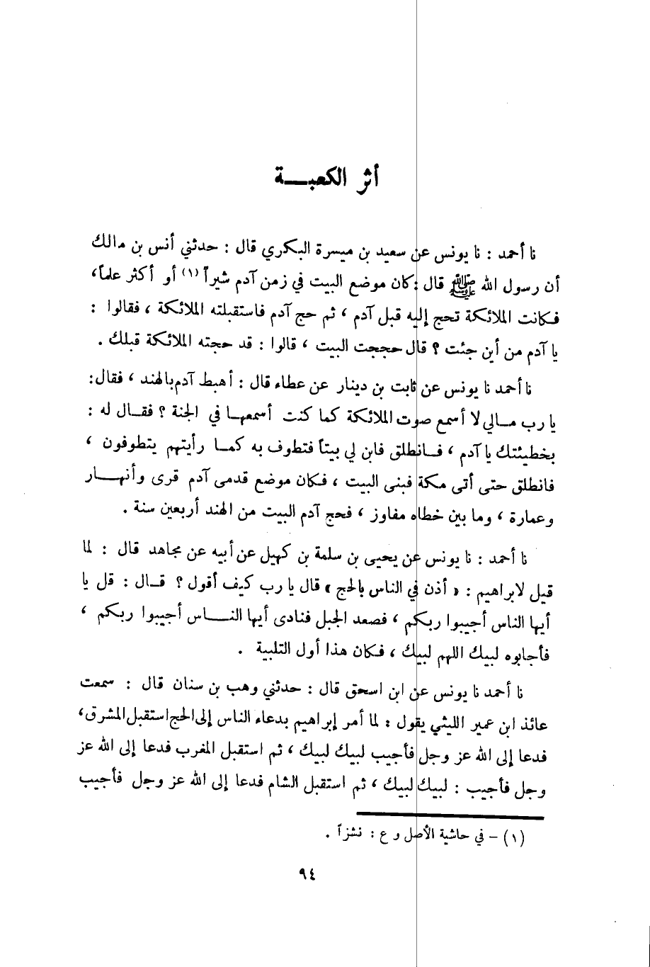 نا أحمد: نا يونس عن سعيد بن ميسرة البكري قال: حدثني أنس بن مالك أن رسول الله صلى الله عليه وسلم قال: كان موضع البيت في زمن آدم شيراً «1» أو أكثر علماً، فكانت الملائكة تحج إليه قبل آدم، ثم حج آدم فاستقبلته الملائكة، فقالوا: