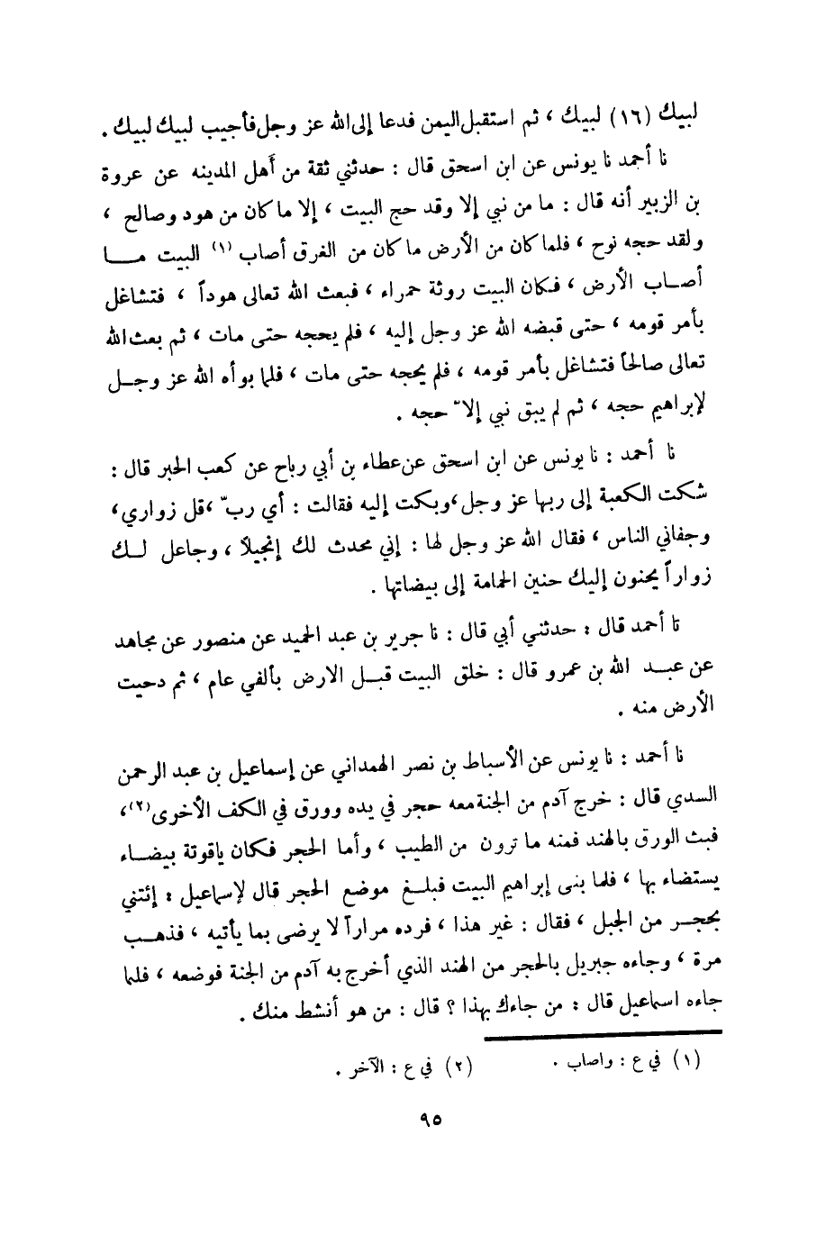 نا أحمد نا يونس عن ابن إسحق قال: حدثني ثقة من أهل المدينة عن عروة بن الزبير أنه قال: ما من نبي إلا وقد حج البيت، إلا ما كان من هود وصالح، ولقد حجه نوح، فلما كان من الأرض ما كان من الغرق أصاب «1» البيت ما أصاب الأرض، فكان البيت روثة حمراء، فبعث الله تعالى هوداً، فتشاغل بأمر قومه، حتى قبضه الله عز وجل إليه، فلم يججه حتى مات، ثم بعث الله تعالى صالحاً فتشاغل بأمر قومه، فلم يحجه حتى مات، فلما بوأه الله عز وجل لإبراهيم حجه، ثم لم يبق نبي إلا حجه.