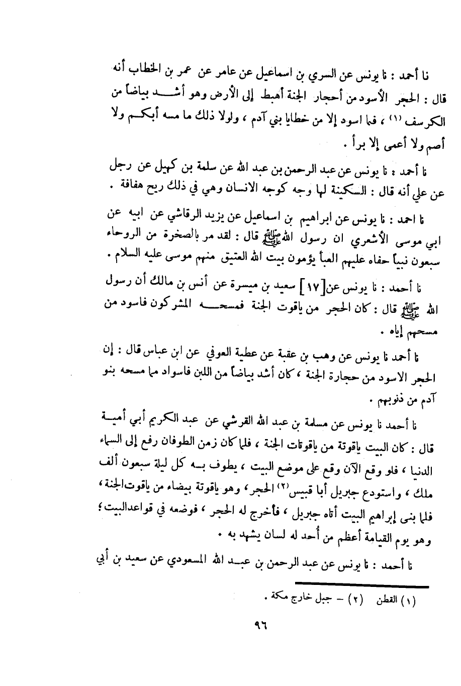 نا أحمد: نا يونس عن [17] سعيد بن ميسرة عن أنس بن مالك إن رسول الله صلى الله عليه وسلم قال: كان الحجر من ياقوت الجنة فمسحه المشركون فاسود من مسحهم إياه.