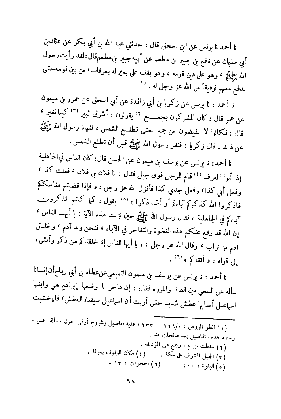 نا أحمد نا يونس عن ابن إسحق قال: حدثني عبد الله بن أبي بكر عن عثمان بن أبي سليمان عن نافع بن جبير بن مطعم عن أبيه جبير بن مطعم قال: لقد رأيت رسول الله صلى الله عليه وسلم، وهو على دين قومه، وهو يقف على بعير له بعرفات، من بين قومه حتى يدفع معهم توفيقا من الله عز وجل له. «1»