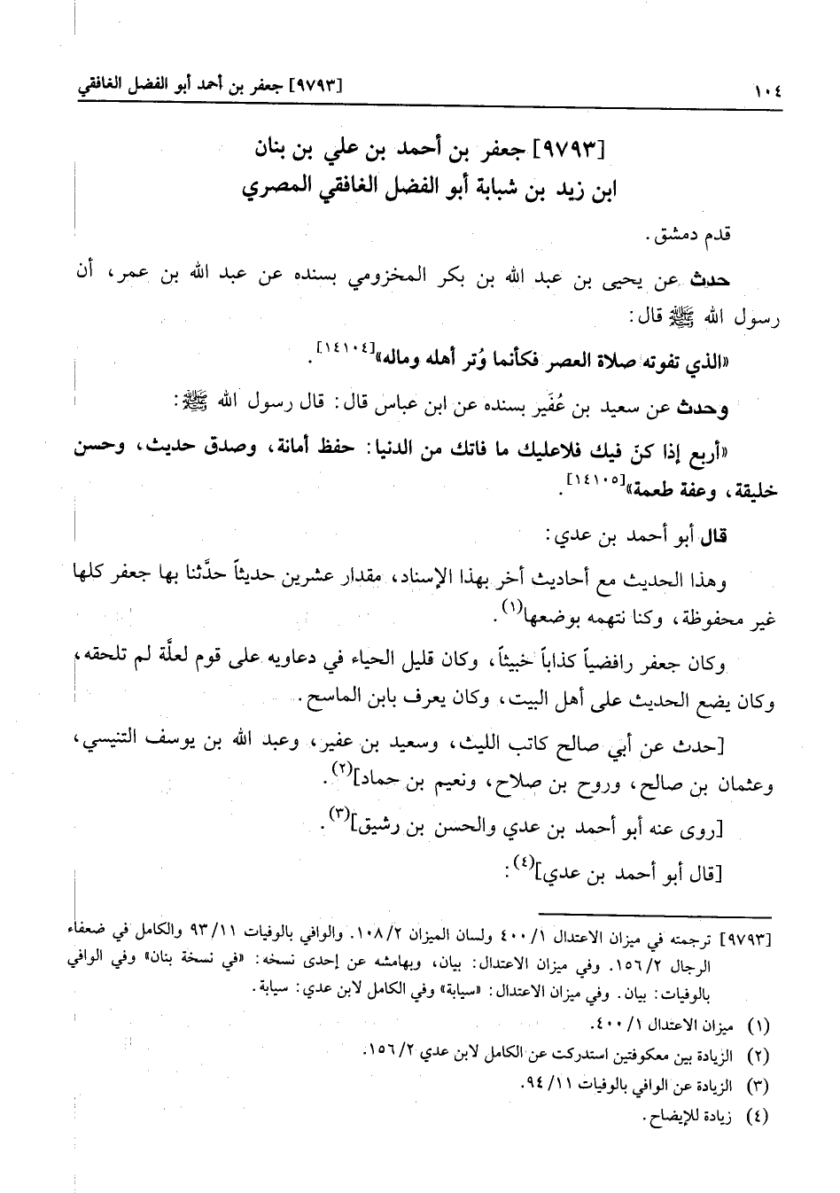 [9793] ترجمته في ميزان الاعتدال 1/400 ولسان الميزان 2/108. والوافي بالوفيات 11/93 والكامل في ضعفاء الرجال 2/156. وفي ميزان الاعتدال: بيان، وبهامشه عن إحدى نسخه: «في نسخة بنان» وفي الوافي بالوفيات: بيان. وفي ميزان الاعتدال: «سيابة» وفي الكامل لابن عدي: سيابة.