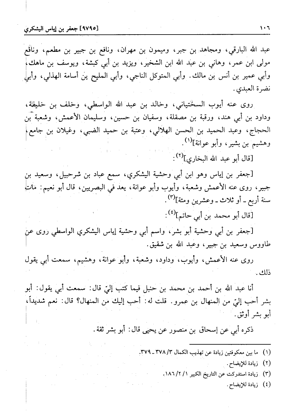 [جعفر بن أبي وحشية أبو بشر، واسم أبي وحشية إياس اليشكري الواسطي روى عن طاووس وسعيد بن جبير، وعبد الله بن شقيق.