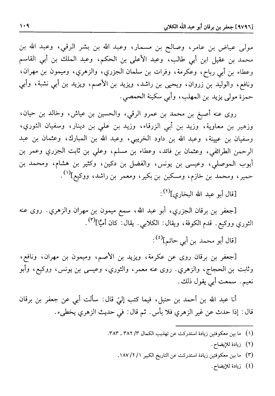 [جعفر بن برقان روى عن عكرمة، ويزيد بن الأصم، وميمون بن مهران، ونافع، وثابت بن الحجاج، والزهري. روى عنه معمر، والثوري، وعيسى بن يونس، ووكيع، وأبو نعيم. سمعت أبي يقول ذلك. أنا عبد الله بن أحمد بن حنبل، فيما كتب إليّ قال: سألت أبي عن جعفر بن برقان قال: إذا حدث عن غير الزهري فلا بأس. ثم قال: في حديث الزهري يخطىء.