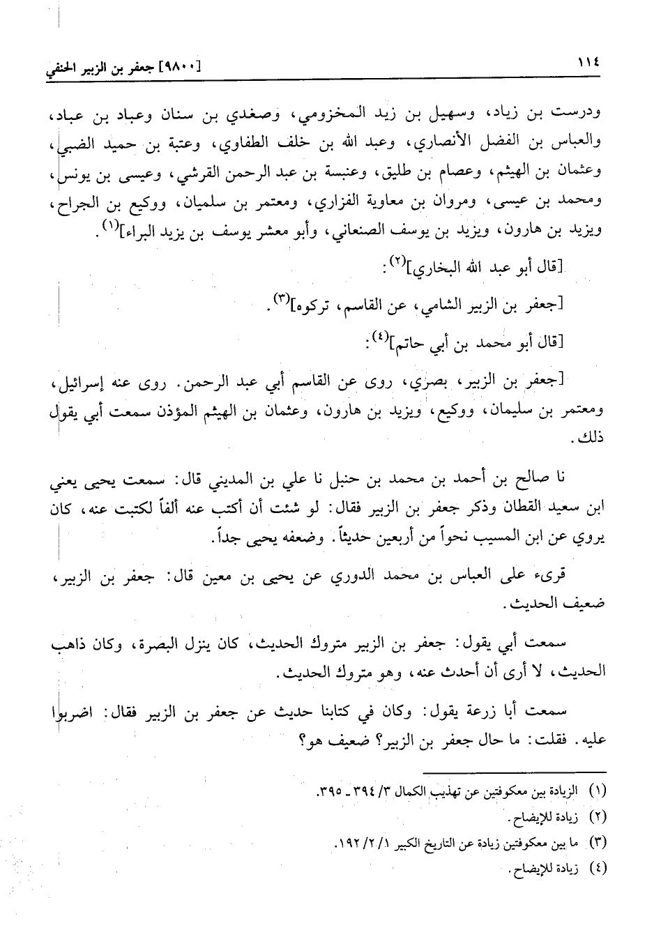 [جعفر بن الزبير، بصري، روى عن القاسم أبي عبد الرحمن. روى عنه إسرائيل، ومعتمر بن سليمان، ووكيع، ويزيد بن هارون، وعثمان بن الهيثم المؤذن سمعت أبي يقول ذلك.