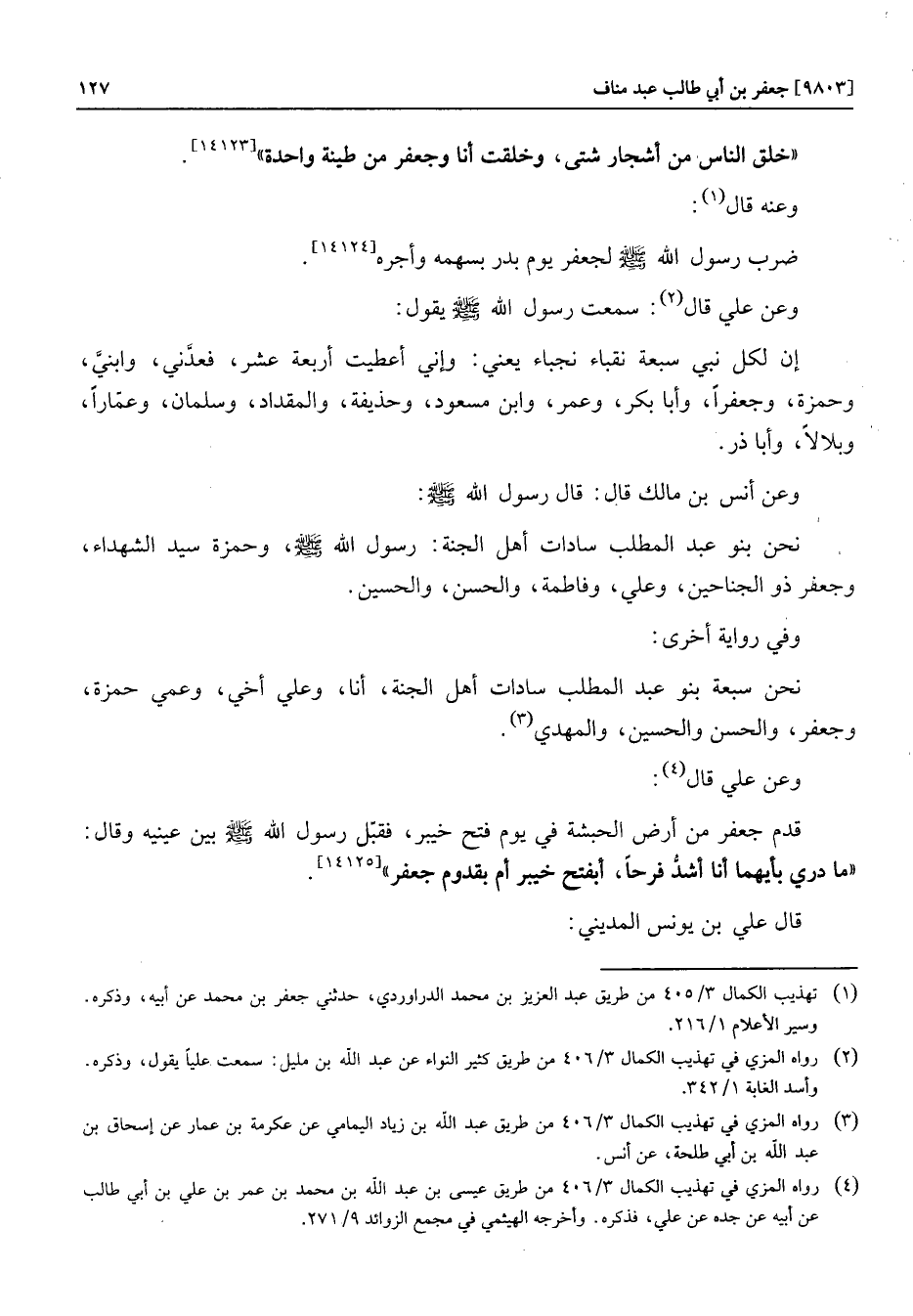 نحن سبعة بنو عبد المطلب سادات أهل الجنة، أنا، وعلي أخي، وعمي حمزة، وجعفر، والحسن والحسين، والمهدي «3» .