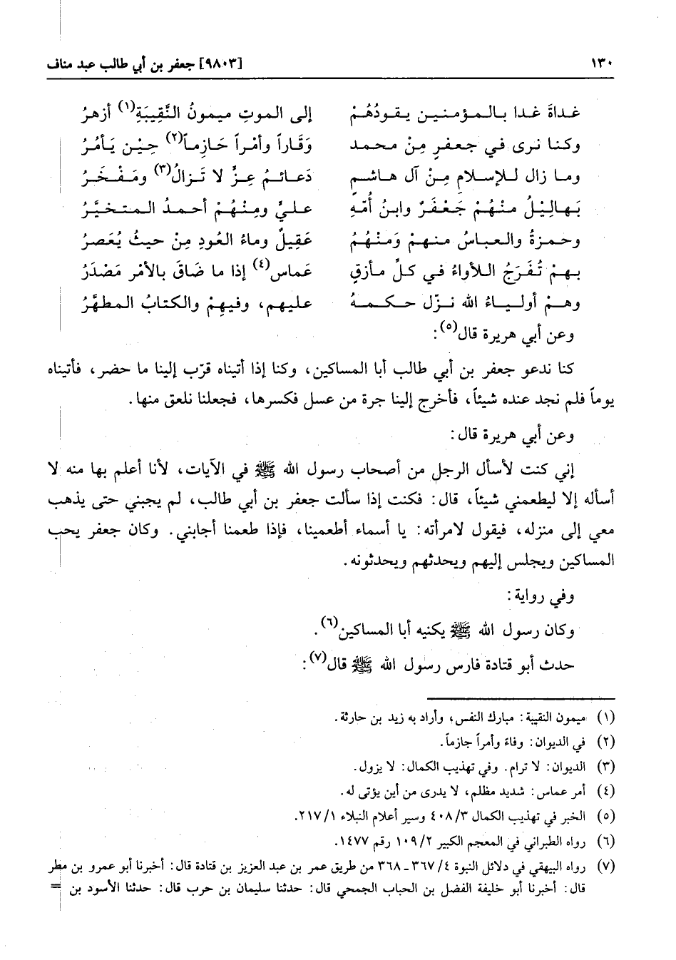 إني كنت لأسأل الرجل من أصحاب رسول الله صلى الله عليه وسلم في الآيات، لأنا أعلم بها منه لا أسأله إلا ليطعمني شيئا، قال: فكنت إذا سألت جعفر بن أبي طالب، لم يجبني حتى يذهب معي إلى منزله، فيقول لامرأته: يا أسماء أطعمينا، فإذا طعمنا أجابني. وكان جعفر يحب المساكين ويجلس إليهم ويحدثهم ويحدثونه.