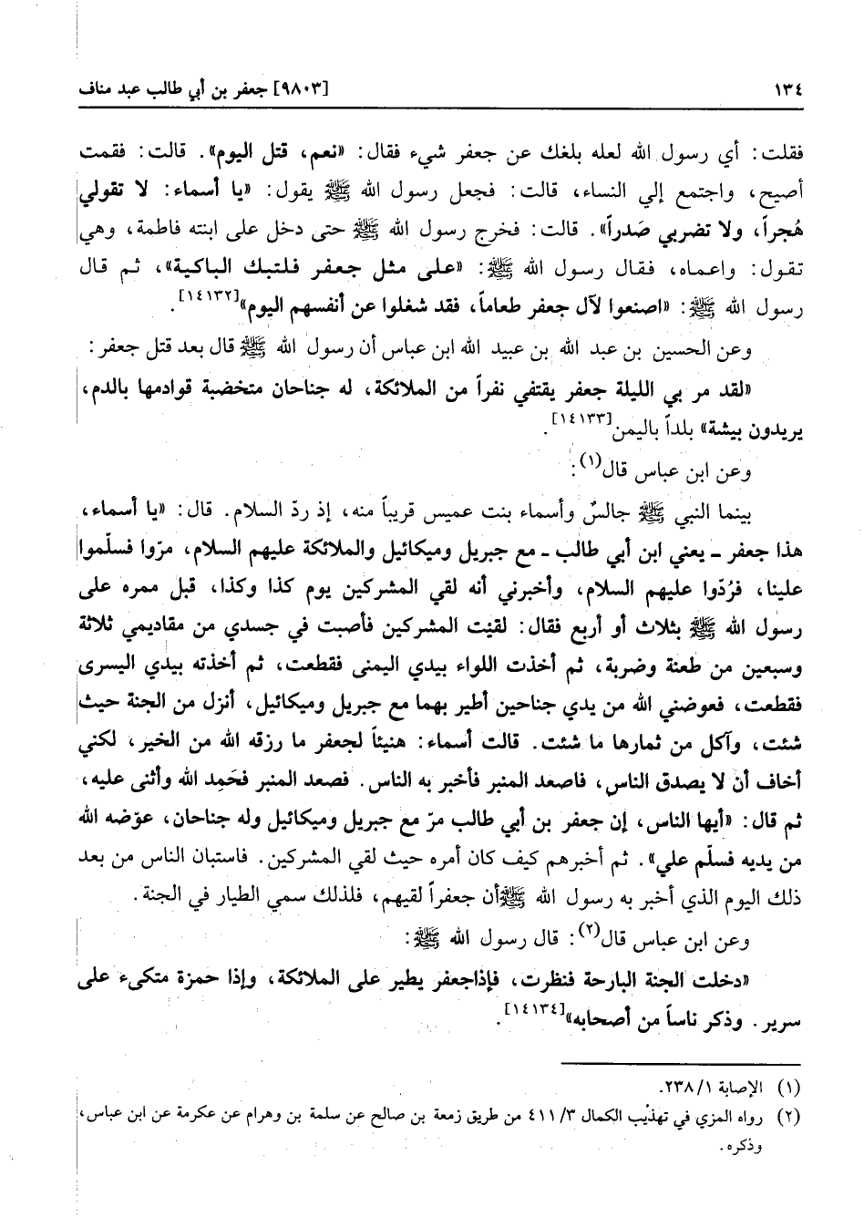 «لقد مر بي الليلة جعفر يقتفي نفرا من الملائكة، له جناحان متخضبة قوادمها بالدم، يريدون بيشة» بلدا باليمن