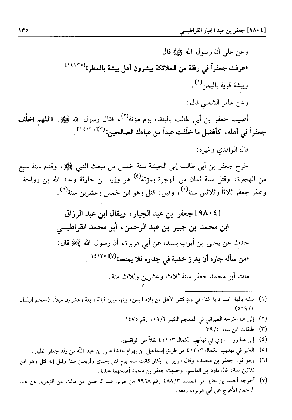 خرج جعفر بن أبي طالب إلى الحبشة سنة خمس من مبعث النبي صلى الله عليه وسلم، وقدم سنة سبع من الهجرة، وقتل سنة ثمان من الهجرة بمؤتة «4» هو وزيد بن حارثة وعبد الله بن رواحة.