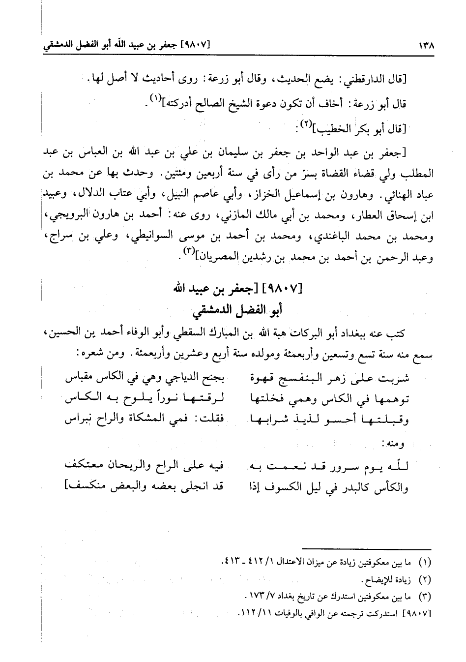 [9807] [جعفر بن عبيد الله أبو الفضل الدمشقي كتب عنه ببغداد أبو البركات هبة الله بن المبارك السقطي وأبو الوفاء أحمد بن الحسين، سمع منه سنة تسع وتسعين وأربعمئة ومولده سنة أربع وعشرين وأربعمئة. ومن شعره: