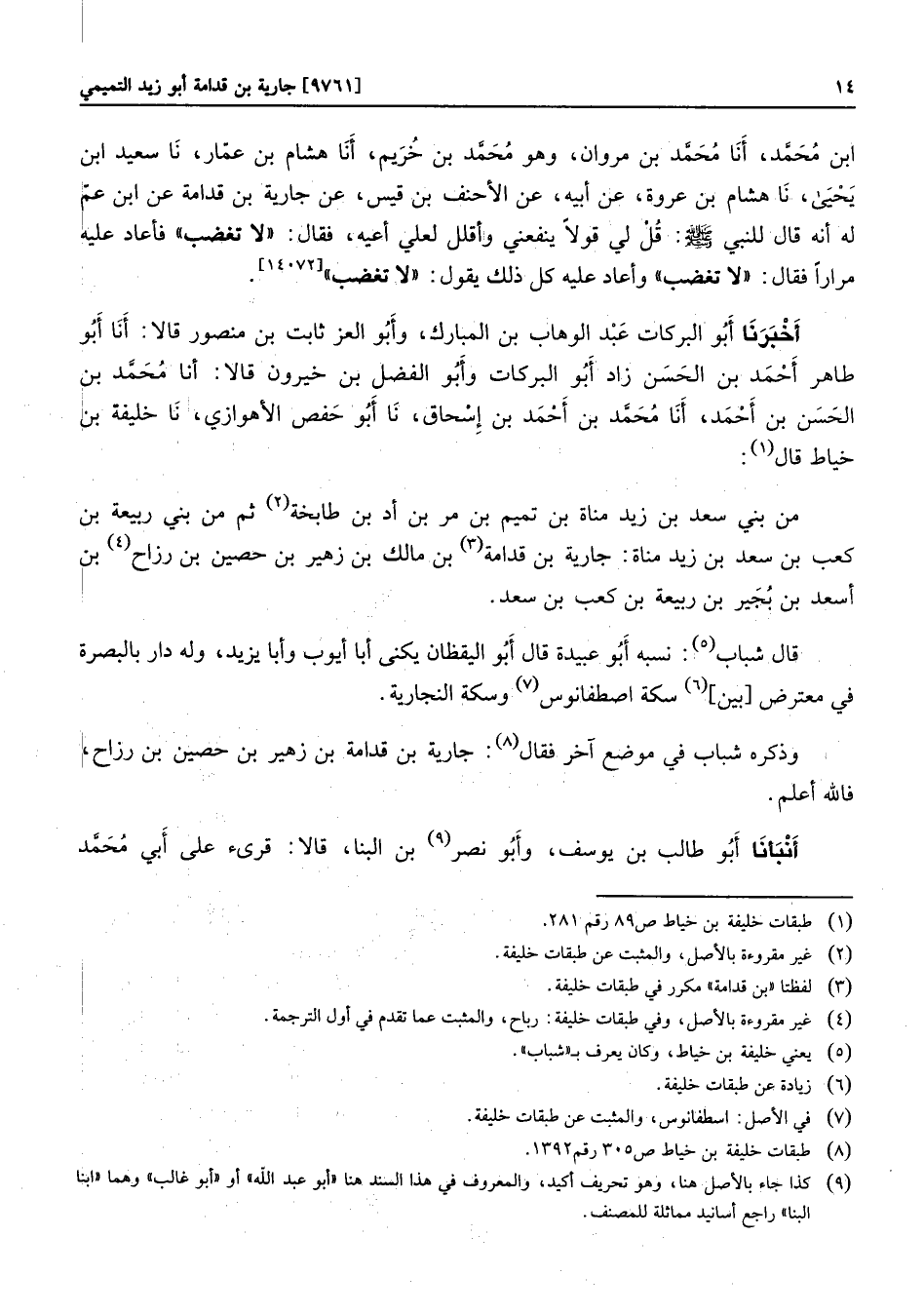 ابن محمّد، أنا محمّد بن مروان، وهو محمّد بن خريم، أنا هشام بن عمّار، نا سعيد ابن يحيى، نا هشام بن عروة، عن أبيه، عن الأحنف بن قيس، عن جارية بن قدامة عن ابن عمّ له أنه قال للنبي صلى الله عليه وسلم: قل لي قولا ينفعني وأقلل لعلي أعيه، فقال: «لا تغضب» فأعاد عليه مرارا فقال: «لا تغضب» وأعاد عليه كل ذلك يقول: «لا تغضب»