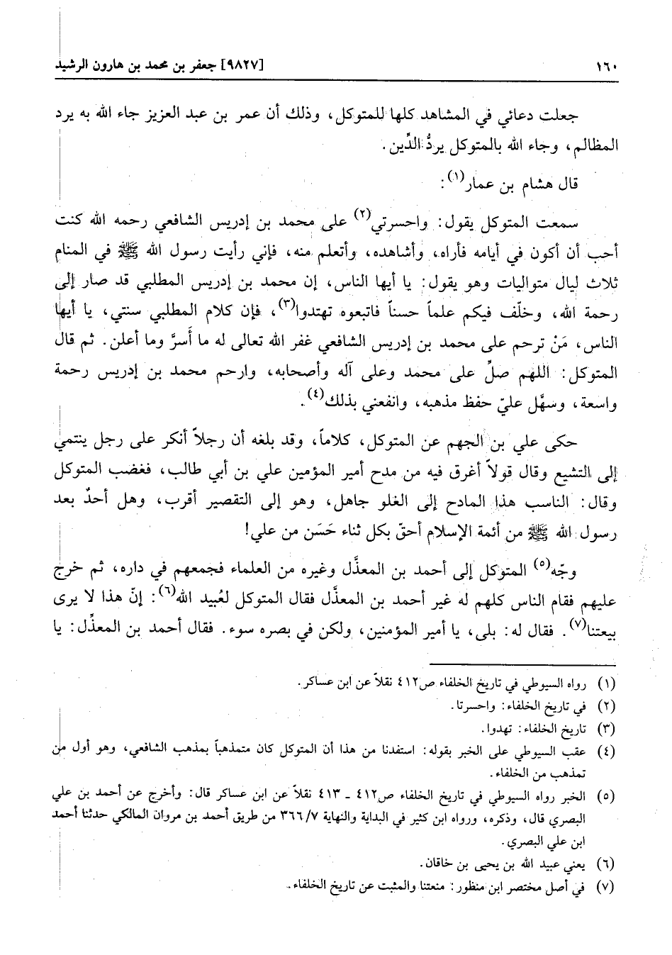 قال هشام بن عمار «1» : سمعت المتوكل يقول: وا حسرتي «2» على محمد بن إدريس الشافعي رحمه الله كنت أحب أن أكون في أيامه فأراه، وأشاهده، وأتعلم منه، فإني رأيت رسول الله صلى الله عليه وسلم في المنام ثلاث ليال متواليات وهو يقول: يا أيها الناس، إن محمد بن إدريس المطلبي قد صار إلى رحمة الله، وخلّف فيكم علما حسنا فاتبعوه تهتدوا «3» ، فإن كلام المطلبي سنتي، يا أيها الناس، من ترحم على محمد بن إدريس الشافعي غفر الله تعالى له ما أسرّ وما أعلن. ثم قال المتوكل: اللهم صلّ على محمد وعلى آله وأصحابه، وارحم محمد بن إدريس رحمة واسعة، وسهّل عليّ حفظ مذهبه، وانفعني بذلك «4» .