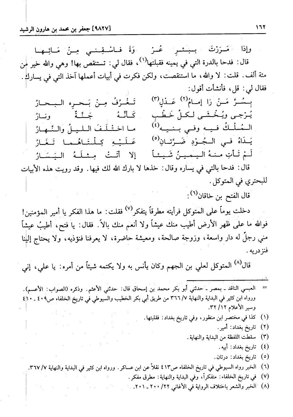 دخلت يوما على المتوكل فرأيته مطرقا يتفكر «7» فقلت: ما هذا الفكر يا أمير المؤمنين! فو الله ما على ظهر الأرض أطيب منك عيشا ولا أنعم منك بالا. فقال: يا فتح، أطيب عيشا مني رجل له دار واسعة، وزوجة صالحة، ومعيشة حاضرة، لا يعرفنا فنؤذيه، ولا يحتاج إلينا فنزدريه.