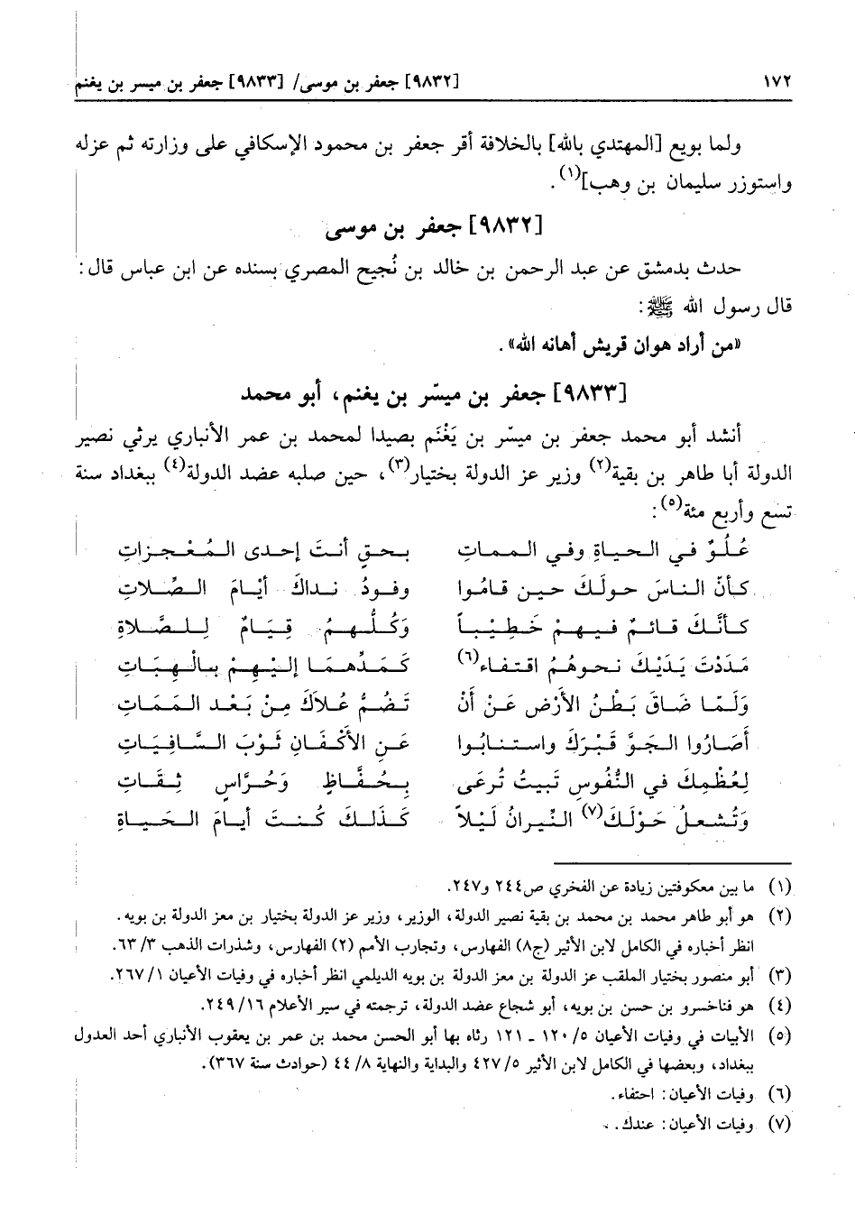 أنشد أبو محمد جعفر بن ميسّر بن يغنم بصيدا لمحمد بن عمر الأنباري يرثي نصير الدولة أبا طاهر بن بقية «2» وزير عز الدولة بختيار «3» ، حين صلبه عضد الدولة «4» ببغداد سنة تسع وأربع مئة «5» :