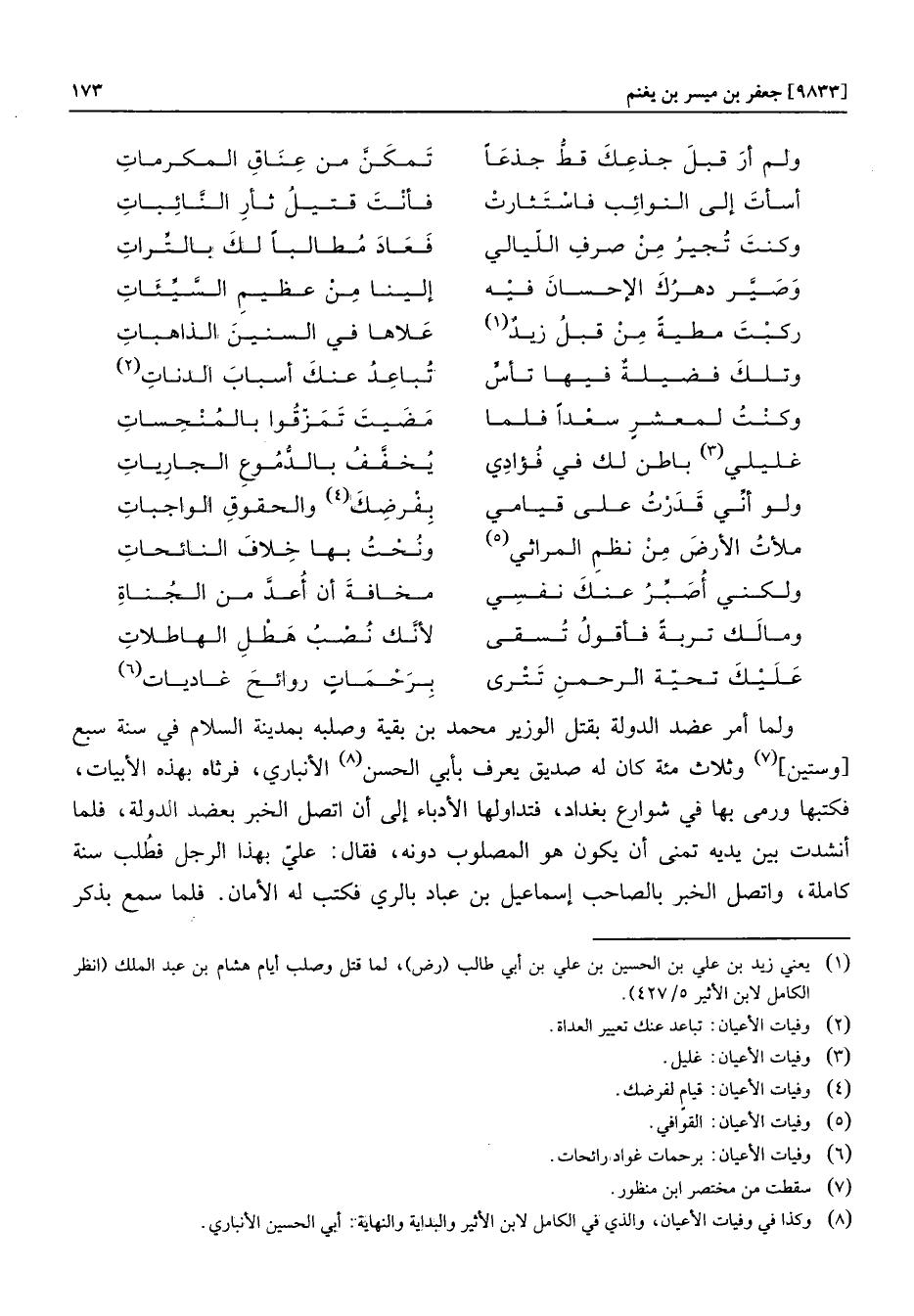 ولما أمر عضد الدولة بقتل الوزير محمد بن بقية وصلبه بمدينة السلام في سنة سبع [وستين] «7» وثلاث مئة كان له صديق يعرف بأبي الحسن «8» الأنباري، فرثاه بهذه الأبيات، فكتبها ورمى بها في شوارع بغداد، فتداولها الأدباء إلى أن اتصل الخبر بعضد الدولة، فلما أنشدت بين يديه تمنى أن يكون هو المصلوب دونه، فقال: عليّ بهذا الرجل فطلب سنة كاملة، واتصل الخبر بالصاحب إسماعيل بن عباد بالري فكتب له الأمان. فلما سمع بذكر