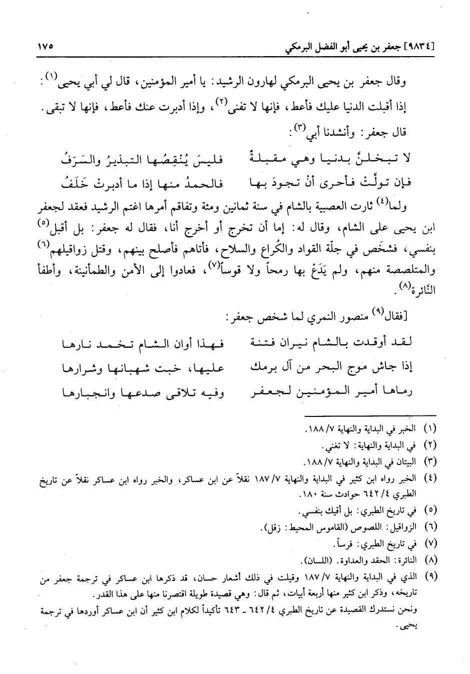 ولما «4» ثارت العصبية بالشام في سنة ثمانين ومئة وتفاقم أمرها اغتم الرشيد فعقد لجعفر ابن يحيى على الشام، وقال له: إما أن تخرج أو أخرج أنا، فقال له جعفر: بل أقبل «5» بنفسي، فشخص في جلّة القواد والكراع والسلاح، فأتاهم فأصلح بينهم، وقتل زواقيلهم «6» والمتلصصة منهم، ولم يدع بها رمحا ولا قوسا «7» ، فعادوا إلى الأمن والطمأنينة، وأطفأ النّائرة «8» .