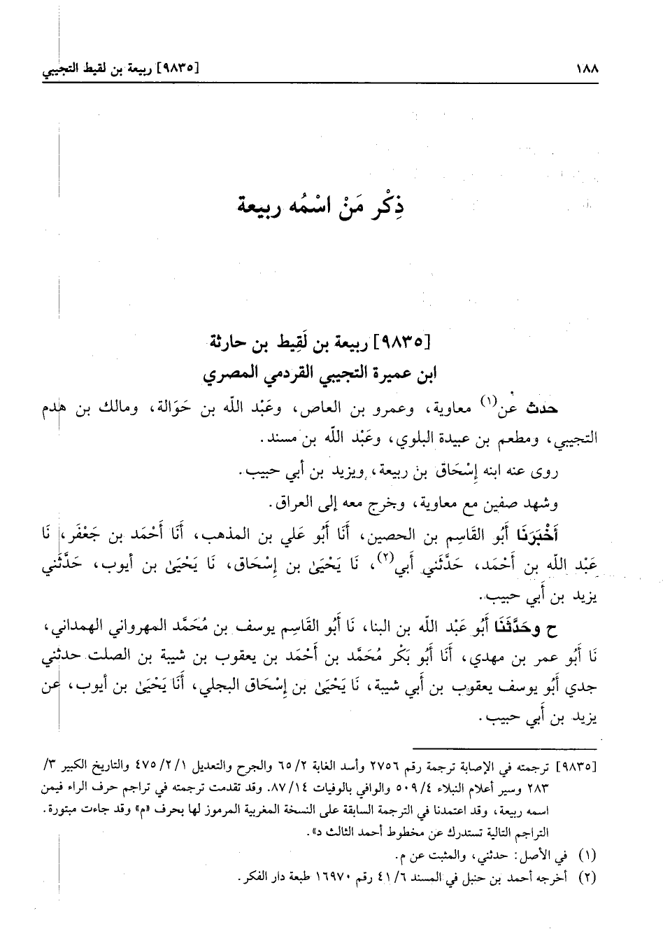 أخبرنا أبو القاسم بن الحصين، أنا أبو علي بن المذهب، أنا أحمد بن جعفر، نا عبد الله بن أحمد، حدّثني أبي «2» ، نا يحيى بن إسحاق، نا يحيى بن أيوب، حدّثني يزيد بن أبي حبيب.