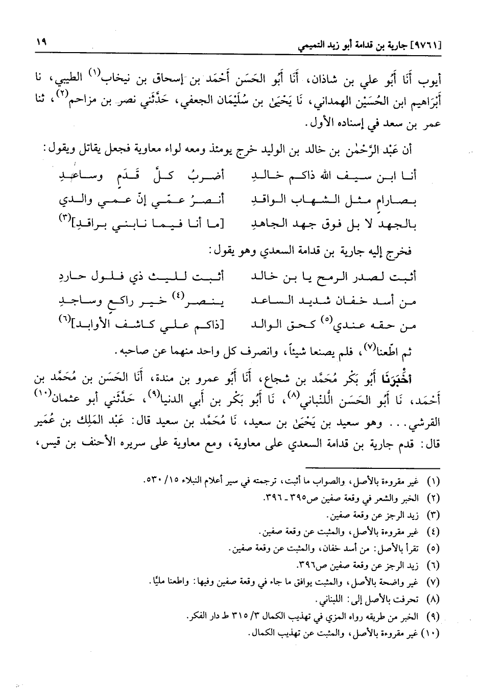أخبرنا أبو بكر محمّد بن شجاع، أنا أبو عمرو بن مندة، أنا الحسن بن محمّد بن أحمد، نا أبو الحسن الّلنباني «8» ، نا أبو بكر بن أبي الدنيا «9» ، حدّثني أبو عثمان «10» القرشي ... وهو سعيد بن يحيى بن سعيد، نا محمّد بن سعيد قال: عبد الملك بن عمير قال: قدم جارية بن قدامة السعدي على معاوية، ومع معاوية على سريره الأحنف بن قيس،