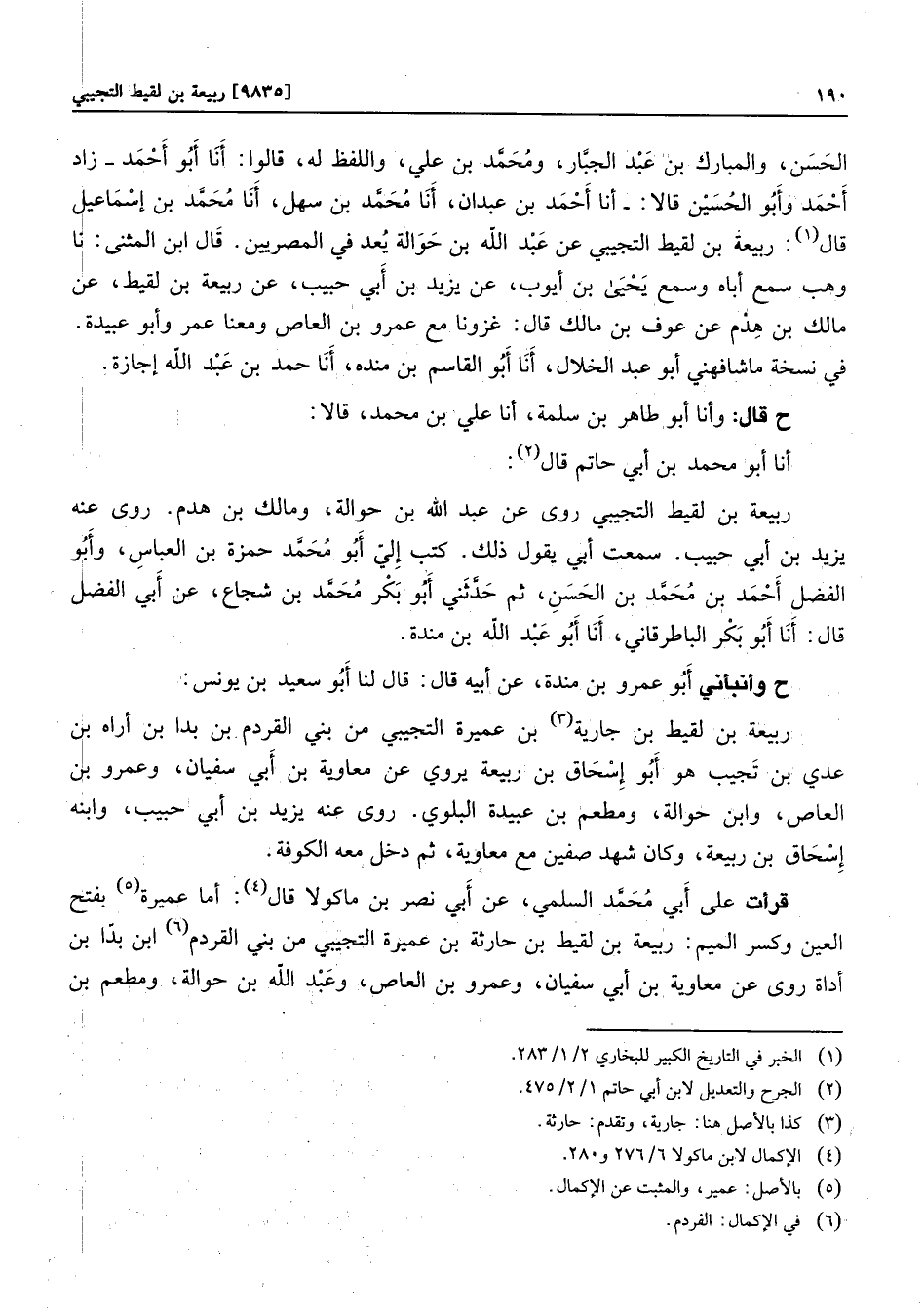 الحسن، والمبارك بن عبد الجبّار، ومحمّد بن علي، واللفظ له، قالوا: أنا أبو أحمد- زاد أحمد وأبو الحسين قالا: - أنا أحمد بن عبدان، أنا محمّد بن سهل، أنا محمّد بن إسماعيل قال «1» : ربيعة بن لقيط التجيبي عن عبد الله بن حوالة يعد في المصريين. قال ابن المثنى: نا وهب سمع أباه وسمع يحيى بن أيوب، عن يزيد بن أبي حبيب، عن ربيعة بن لقيط، عن مالك بن هدم عن عوف بن مالك قال: غزونا مع عمرو بن العاص ومعنا عمر وأبو عبيدة.