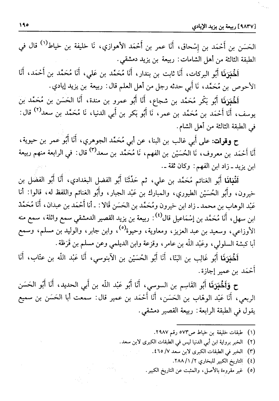 ح وقرأت: على أبي غالب بن البنا، عن أبي محمّد الجوهري، أنا أبو عمر بن حيوية، أنا أحمد بن معروف، نا الحسين بن الفهم، نا محمّد بن سعد «3» قال: في الرابعة منهم ربيعة ابن يزيد- زاد ابن الفهم: وكان ثقة-. أنبأنا أبو الغنائم محمّد بن علي، ثم حدّثنا أبو الفضل البغدادي، أنا أبو الفضل بن خيرون، وأبو الحسين الطيوري، والمبارك بن عبد الجبار، وأبو الغنائم واللفظ له، قالوا: أنا عبد الوهاب بن محمد- زاد ابن خيرون ومحمّد بن الحسن قالا: - أنا أحمد بن عبدان، أنا محمّد ابن سهل، أنا محمّد بن إسماعيل قال «4» : ربيعة بن يزيد القصير الدمشقي سمع واثلة، سمع منه الأوزاعي، وسعيد بن عبد العزيز، ومعاوية، وحيوة «5» ، وابن جابر، والوليد بن مسلم، وسمع أبا كبشة السلولي، وعبد الله بن عامر، وقزعة وابن الديلمي وعن مسلم بن قرظة.