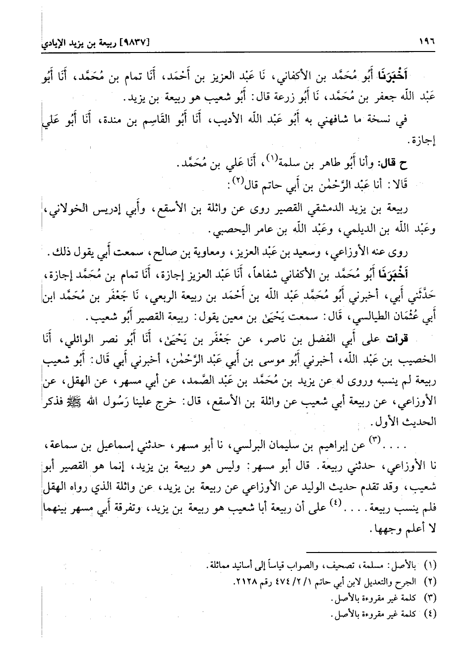 .... «3» عن إبراهيم بن سليمان البرلسي، نا أبو مسهر، حدثني إسماعيل بن سماعة، نا الأوزاعي، حدثني ربيعة. قال أبو مسهر: وليس هو ربيعة بن يزيد، إنما هوالقصير أبو شعيب، وقد تقدم حديث الوليد عن الأوزاعي عن ربيعة بن يزيد، عن واثلة الذي رواه الهقل فلم ينسب ربيعة.... «4» على أن ربيعة أبا شعيب هو ربيعة بن يزيد، وتفرقة أبي مسهر بينهما لا أعلم وجهها.