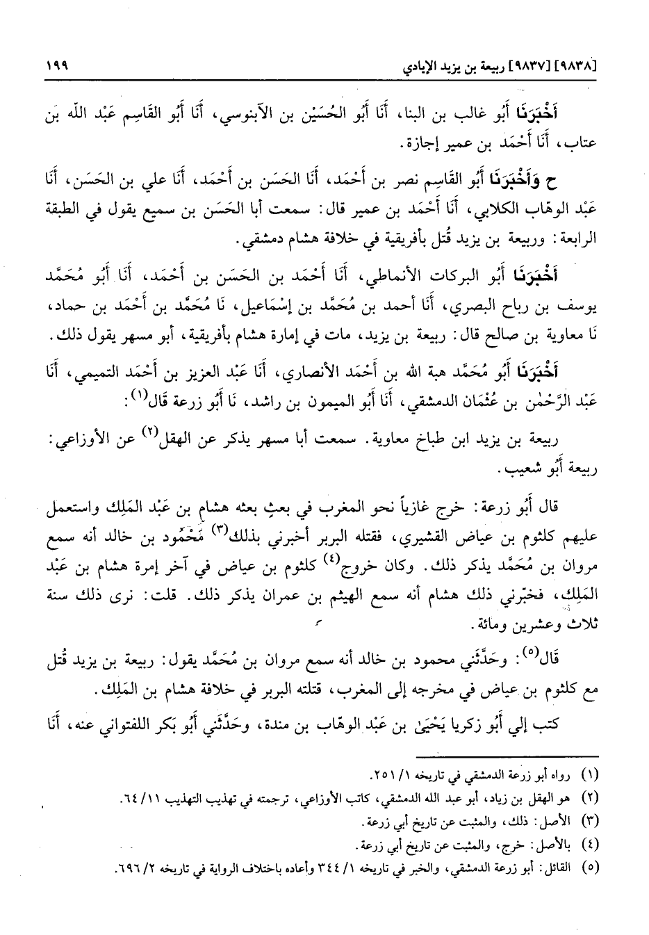 ح وأخبرنا أبو القاسم نصر بن أحمد، أنا الحسن بن أحمد، أنا علي بن الحسن، أنا عبد الوهّاب الكلابي، أنا أحمد بن عمير قال: سمعت أبا الحسن بن سميع يقول في الطبقة الرابعة: وربيعة بن يزيد قتل بأفريقية في خلافة هشام دمشقي. أخبرنا أبو البركات الأنماطي، أنا أحمد بن الحسن بن أحمد، أنا أبو محمّد يوسف بن رباح البصري، أنا أحمد بن محمّد بن إسماعيل، نا محمّد بن أحمد بن حماد، نا معاوية بن صالح قال: ربيعة بن يزيد، مات في إمارة هشام بأفريقية، أبو مسهر يقول ذلك.
