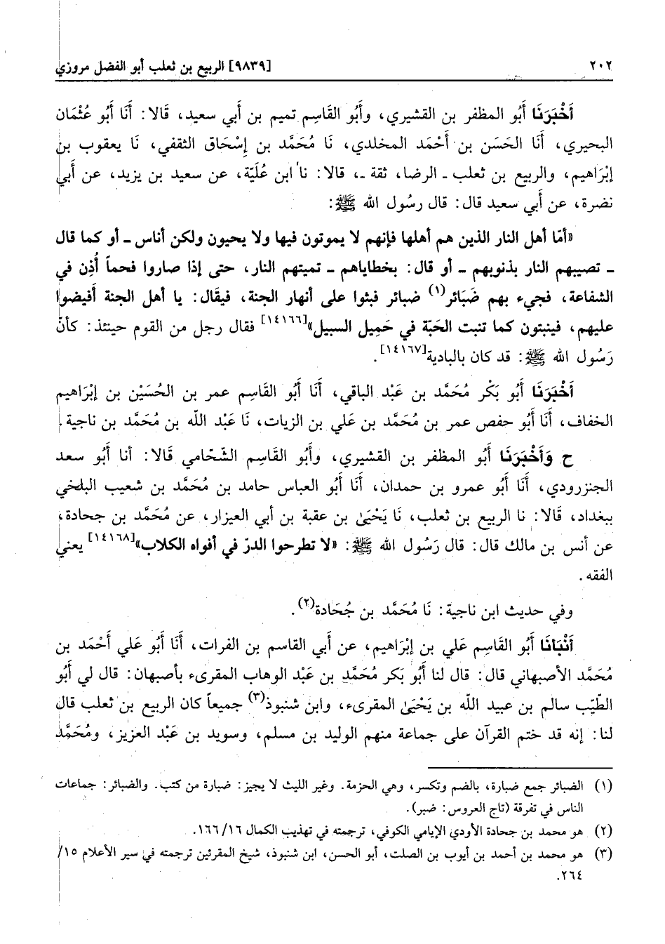 أخبرنا أبو المظفر بن القشيري، وأبو القاسم تميم بن أبي سعيد، قالا: أنا أبو عثمان البحيري، أنا الحسن بن أحمد المخلدي، نا محمّد بن إسحاق الثقفي، نا يعقوب بن إبراهيم، والربيع بن ثعلب- الرضا، ثقة-، قالا: نا ابن عليّة، عن سعيد بن يزيد، عن أبي نضرة، عن أبي سعيد قال: قال رسول الله صلى الله عليه وسلم: