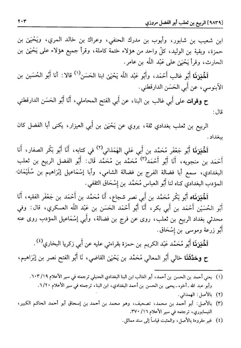 أخبرنا أبو جعفر محمّد بن أبي علي الهمذاني «2» في كتابه، أنا أبو بكر الصفار، أنا أحمد بن منجويه، أنا أبو أحمد «3» محمّد بن محمّد قال: أبو الفضل الربيع بن ثعلب البغدادي، سمع أبا فضالة الفرج بن فضالة الشامي، وأبا إسماعيل إبراهيم بن سليمان المؤدب البغدادي كناه لنا أبو العباس محمّد بن إسحاق الثقفي. أخبرناه أبو بكر محمّد بن أبي نصر شجاع، أنا محمّد بن أحمد بن جعفر الفقيه، أنا أبو الحسين أحمد بن أبي بكر، أنا أبو أحمد الحسن بن عبد الله العسكري، قال: وفي محدثي بغداد الربيع بن ثعلب، روى عن فرج بن فضالة، وأبي إسماعيل المؤدب روى عنه أبو زرعة وموسى بن إسحاق.