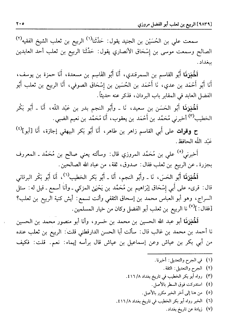 أخبرنا أبو الحس، نا- وأبو النجم، أنا- أبو بكر الخطيب «6» ، أنا أبو بكر البرقاني قال: قرىء على أبي إسحاق إبراهيم بن محمّد بن يحيى المزكي- وأنا أسمع- قيل له: سئل السراج، وهو أبو العباس محمد بن إسحاق الثقفي وأنت تسمع: أيش كنية الربيع بن ثعلب؟
