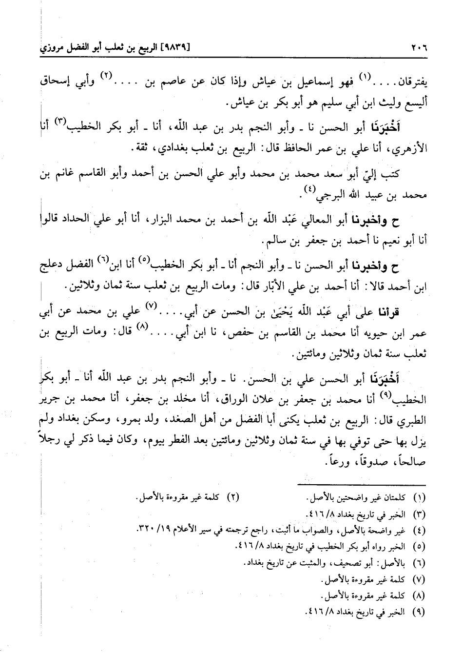 ح وأخبرنا أبو الحسن نا- وأبو النجم أنا- أبو بكر الخطيب «5» أنا ابن «6» الفضل دعلج ابن أحمد قالا: أنا أحمد بن علي الأبّار قال: ومات الربيع بن ثعلب سنة ثمان وثلاثين. قرأنا على أبي عبد الله يحيى بن الحسن عن أبي.... «7» علي بن محمد عن أبي عمر ابن حيويه أنا محمد بن القاسم بن حفص، نا ابن أبي.... «8» قال: ومات الربيع بن ثعلب سنة ثمان وثلاثين ومائتين.