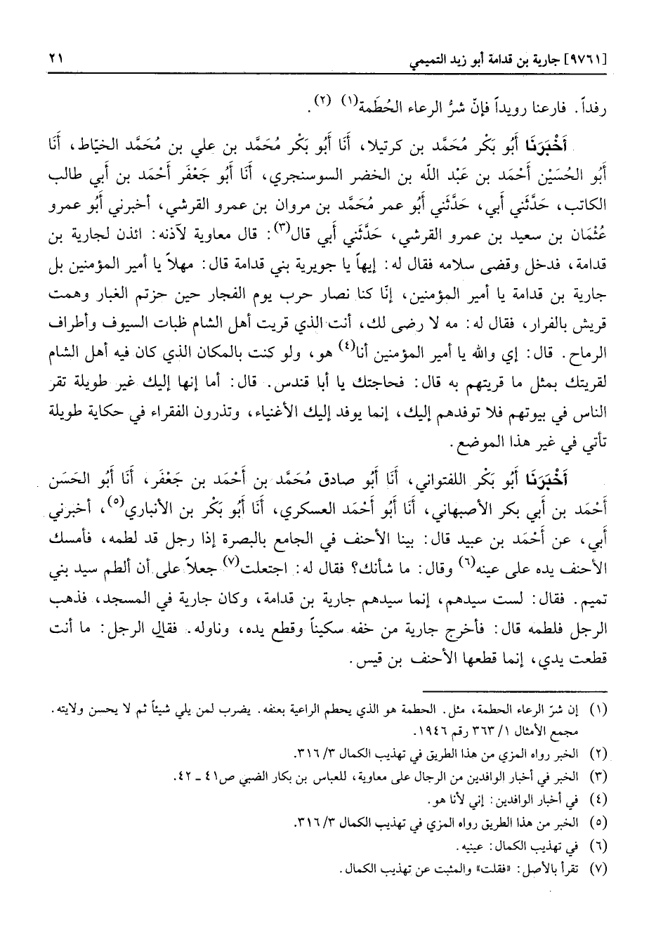 أخبرنا أبو بكر اللفتواني، أنا أبو صادق محمّد بن أحمد بن جعفر، أنا أبو الحسن أحمد بن أبي بكر الأصبهاني، أنا أبو أحمد العسكري، أنا أبو بكر بن الأنباري «5» ، أخبرني أبي، عن أحمد بن عبيد قال: بينا الأحنف في الجامع بالبصرة إذا رجل قد لطمه، فأمسك الأحنف يده على عينه «6» وقال: ما شأنك؟ فقال له: اجتعلت «7» جعلا على أن ألطم سيد بني تميم. فقال: لست سيدهم، إنما سيدهم جارية بن قدامة، وكان جارية في المسجد، فذهب الرجل فلطمه قال: فأخرج جارية من خفه سكينا وقطع يده، وناوله. فقال الرجل: ما أنت قطعت يدي، إنما قطعها الأحنف بن قيس.
