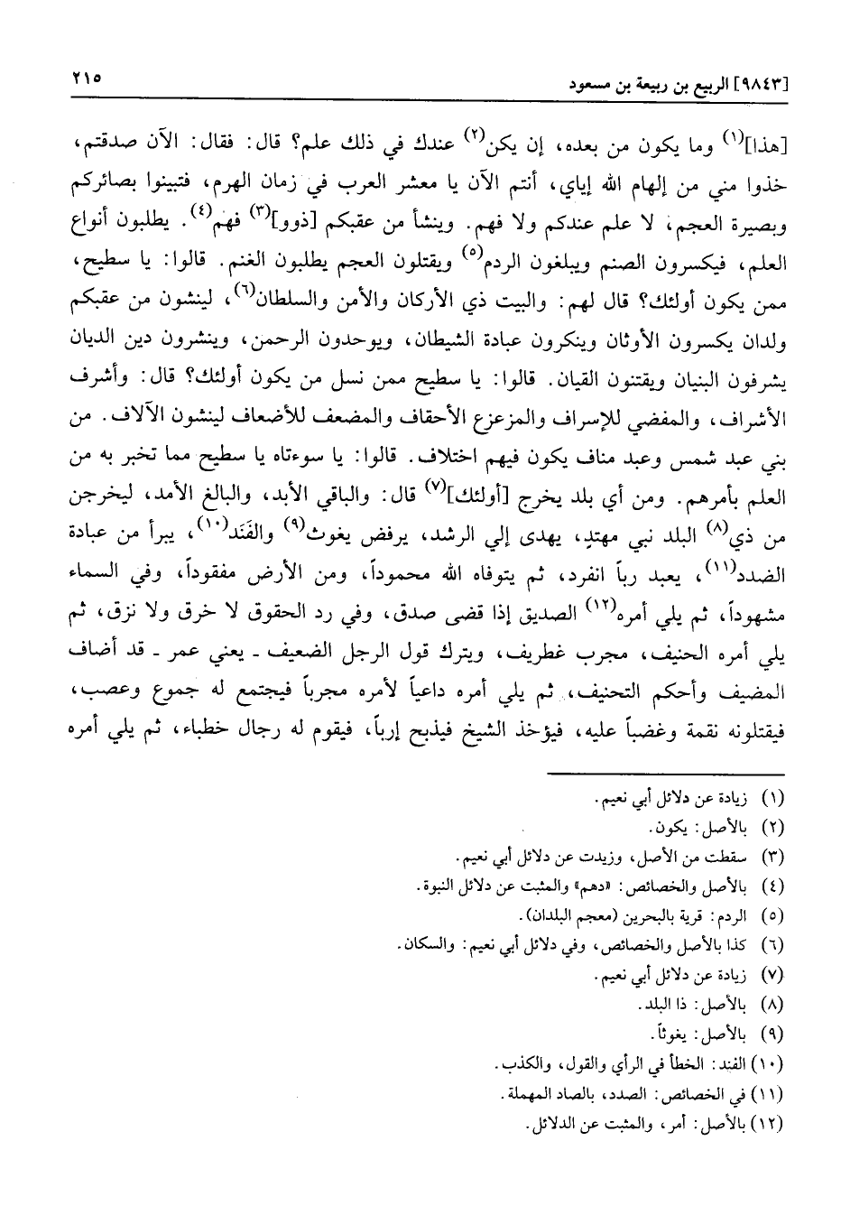 [هذا] «1» وما يكون من بعده، إن يكن «2» عندك في ذلك علم؟ قال: فقال: الآن صدقتم، خذوا مني من إلهام الله إياي، أنتم الآن يا معشر العرب في زمان الهرم، فتبينوا بصائركم وبصيرة العجم، لا علم عندكم ولا فهم. وينشأ من عقبكم [ذوو] «3» فهم «4» . يطلبون أنواع العلم، فيكسرون الصنم ويبلغون الردم «5» ويقتلون العجم يطلبون الغنم. قالوا: يا سطيح، ممن يكون أولئك؟ قال لهم: والبيت ذي الأركان والأمن والسلطان «6» ، لينشون من عقبكم ولدان يكسرون الأوثان وينكرون عبادة الشيطان، ويوحدون الرحمن، وينشرون دين الديان يشرفون البنيان ويقتنون القيان. قالوا: يا سطيح ممن نسل من يكون أولئك؟ قال: وأشرف الأشراف، والمفضي للإسراف والمزعزع الأحقاف والمضعف للأضعاف لينشون الآلاف. من بني عبد شمس وعبد مناف يكون فيهم اختلاف. قالوا: يا سوءتاه يا سطيح مما تخبر به من العلم بأمرهم. ومن أي بلد يخرج [أولئك] «7» قال: والباقي الأبد، والبالغ الأمد، ليخرجن من ذي «8» البلد نبي مهتد، يهدى إلي الرشد، يرفض يغوث «9» والفند «10» ، يبرأ من عبادة الضدد «11» ، يعبد ربا انفرد، ثم يتوفاه الله محمودا، ومن الأرض مفقودا، وفي السماء مشهودا، ثم يلي أمره «12» الصديق إذا قضى صدق، وفي رد الحقوق لا خرق ولا نزق، ثم يلي أمره الحنيف، مجرب غطريف، ويترك قول الرجل الضعيف- يعني عمر- قد أضاف المضيف وأحكم التحنيف، ثم يلي أمره داعيا لأمره مجربا فيجتمع له جموع وعصب، فيقتلونه نقمة وغضبا عليه، فيؤخذ الشيخ فيذبح إربا، فيقوم له رجال خطباء، ثم يلي أمره