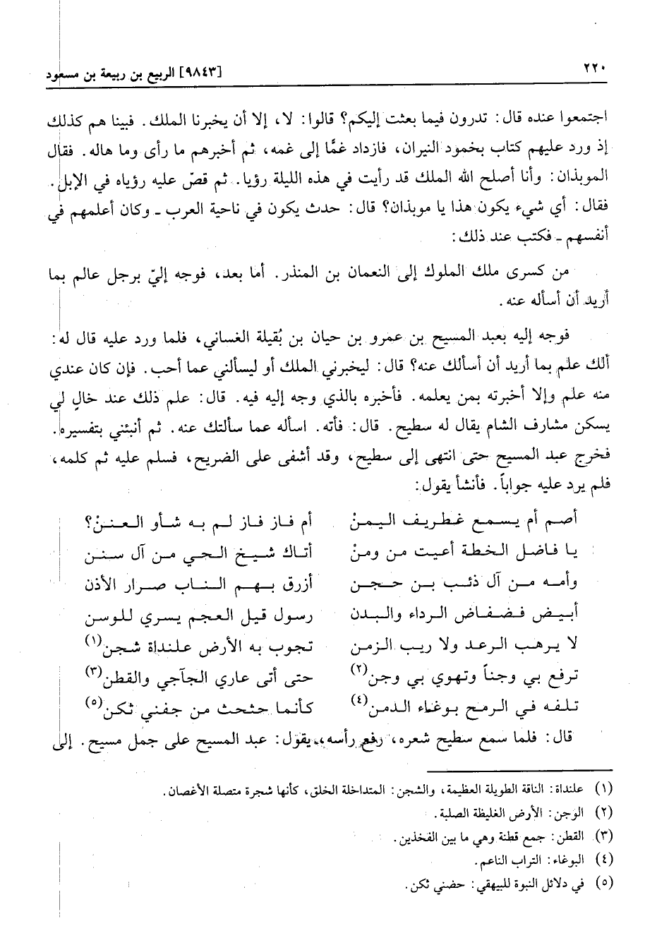 قال: فلما سمع سطيح شعره، رفع رأسه، يقول: عبد المسيح على جمل مسيح. إلى