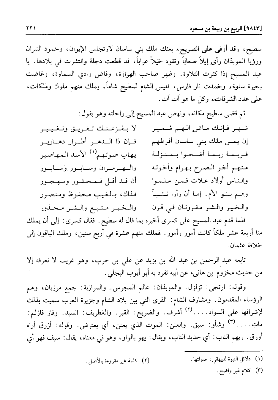 سطيح، وقد أوفى على الضريح، بعثك ملك بني ساسان لارتجاس الإيوان، وخمود النيران ورؤيا الموبذان رأى إبلا صعابا وتقود خيلا عرابا، قد قطعت دجلة وانتشرت في بلادها. يا عبد المسيح إذا كثرت التلاوة. وظهر صاحب الهراوة، وفاض وادي السماوة، وغاضت بحيرة ساوة، وخمدت نار فارس، فليس الشام لسطيح شاما، يملك منهم ملوك وملكات، على عدد الشرفات، وكل ما هو آت آت.