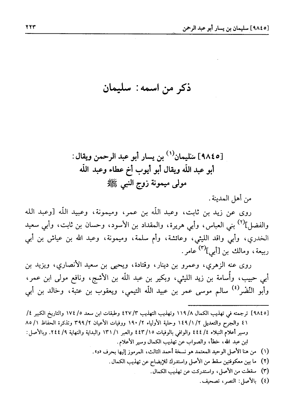 [9845] سليمان «1» بن يسار أبو عبد الرحمن ويقال: أبو عبد الله ويقال أبو أيوب أخ عطاء وعبد الله مولى ميمونة زوج النبي صلى الله عليه وسلم