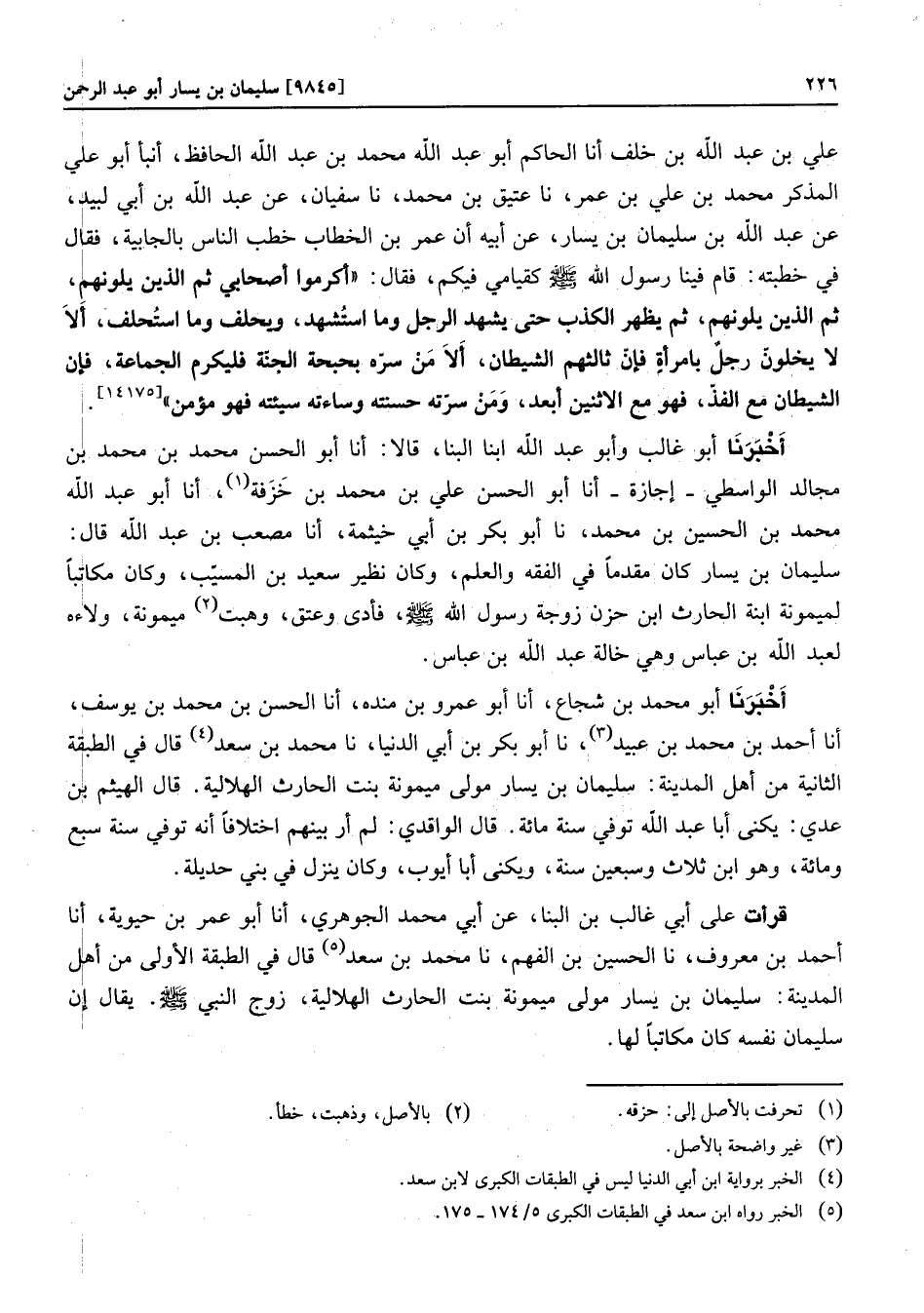 قرأت على أبي غالب بن البنا، عن أبي محمد الجوهري، أنا أبو عمر بن حيوية، أنا أحمد بن معروف، نا الحسين بن الفهم، نا محمد بن سعد «5» قال في الطبقة الأولى من أهل المدينة: سليمان بن يسار مولى ميمونة بنت الحارث الهلالية، زوج النبي صلى الله عليه وسلم. يقال إن سليمان نفسه كان مكاتبا لها.