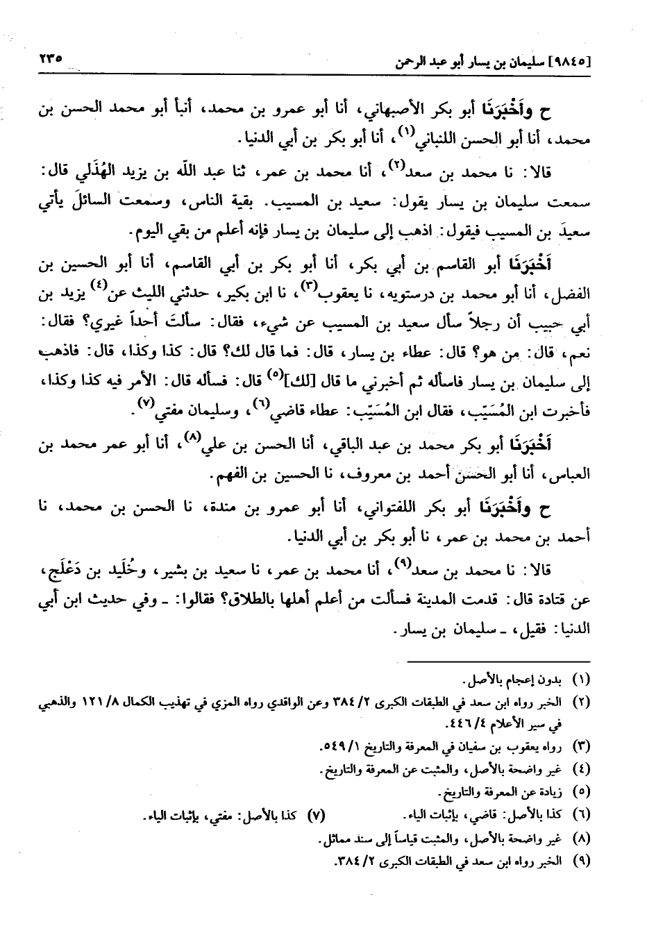 قالا: نا محمد بن سعد «9» ، أنا محمد بن عمر، نا سعيد بن بشير، وخليد بن دعلج، عن قتادة قال: قدمت المدينة فسألت من أعلم أهلها بالطلاق؟ فقالوا: - وفي حديث ابن أبي الدنيا: فقيل، - سليمان بن يسار.
