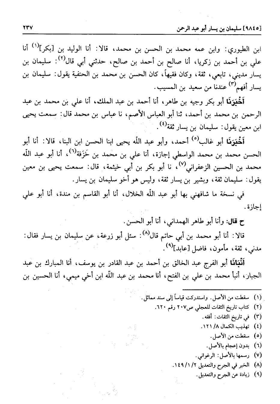 قالا: أنا أبو محمد بن أبي حاتم قال «8» : سئل أبو زرعة، عن سليمان بن يسار فقال:
