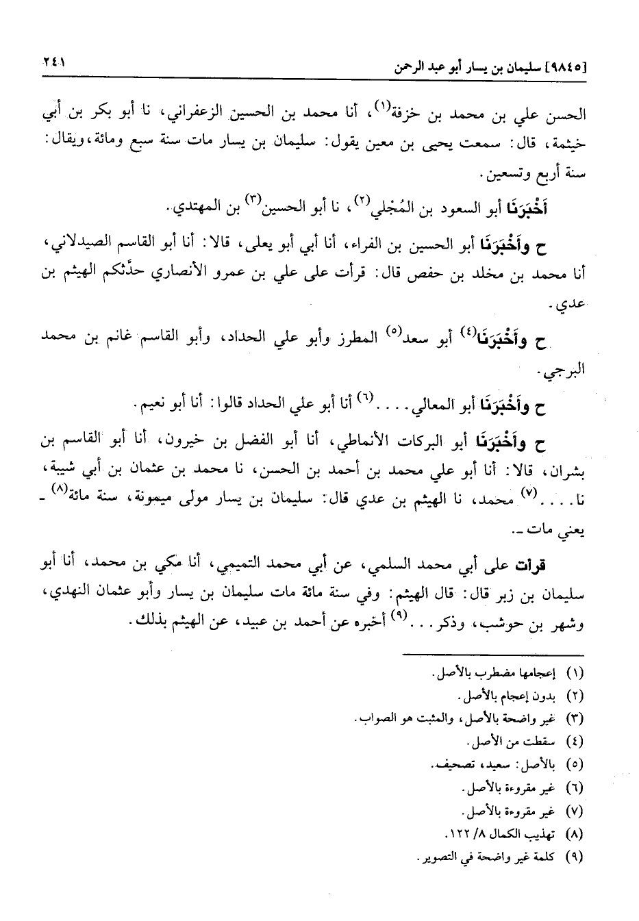 ح وأخبرنا أبو البركات الأنماطي، أنا أبو الفضل بن خيرون، أنا أبو القاسم بن بشران، قالا: أنا أبو علي محمد بن أحمد بن الحسن، نا محمد بن عثمان بن أبي شيبة، نا.... «7» محمد، نا الهيثم بن عدي قال: سليمان بن يسار مولى ميمونة، سنة مائة «8» - يعني مات-.