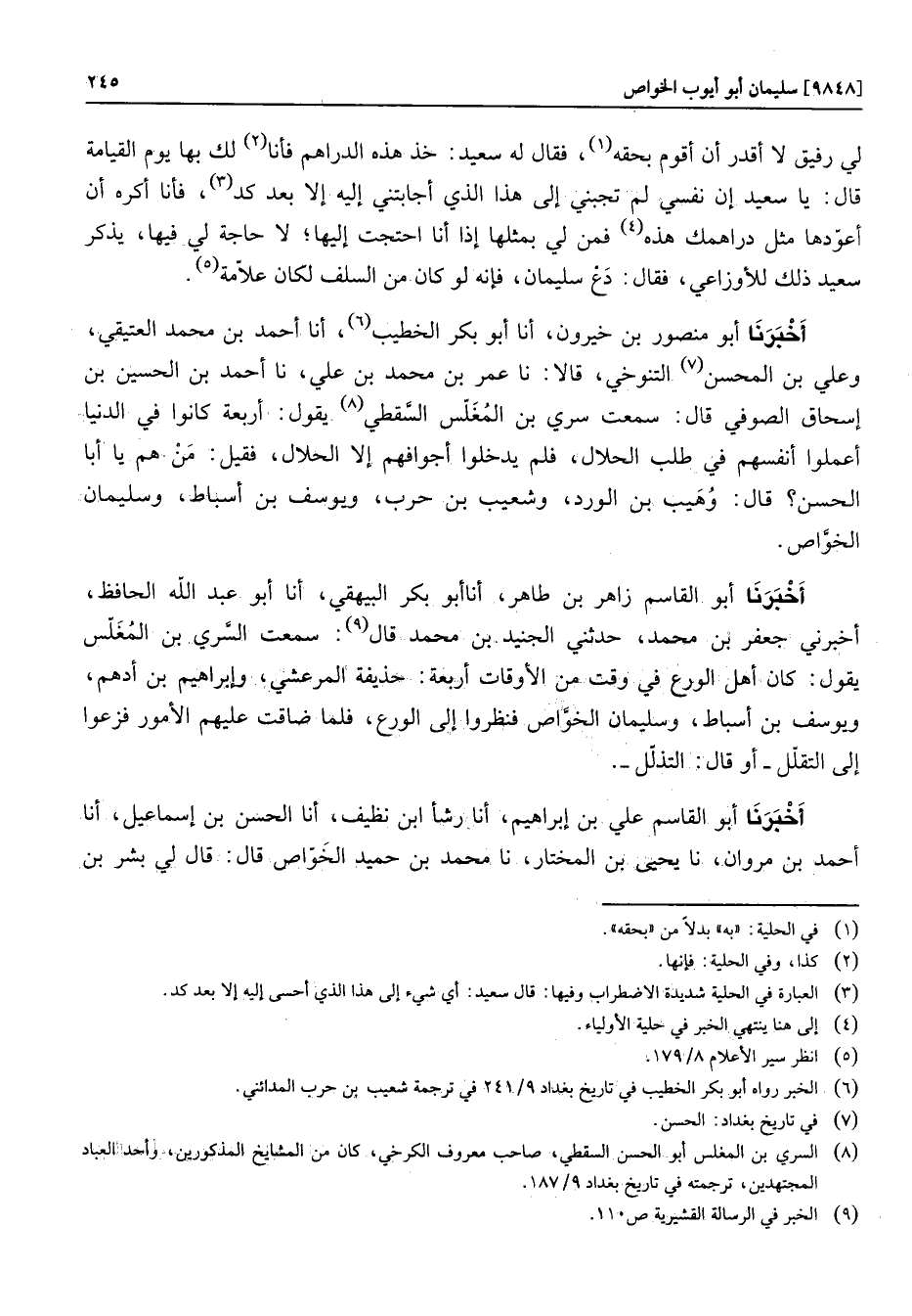 أخبرنا أبو منصور بن خيرون، أنا أبو بكر الخطيب «6» ، أنا أحمد بن محمد العتيقي، وعلي بن المحسن «7» التنوخي، قالا: نا عمر بن محمد بن علي، نا أحمد بنالحسين بن إسحاق الصوفي قال: سمعت سري بن المغلّس السّقطي «8» يقول: أربعة كانوا في الدنيا أعملوا أنفسهم في طلب الحلال، فلم يدخلوا أجوافهم إلا الحلال، فقيل: من هم يا أبا الحسن؟ قال: وهيب بن الورد، وشعيب بن حرب، ويوسف بن أسباط، وسليمان الخوّاص.