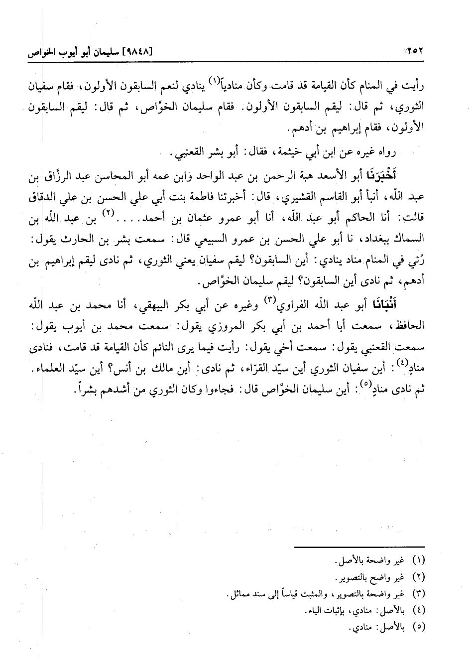 ثم نادى مناد «5» : أين سليمان الخوّاص قال: فجاءوا وكان الثوري من أشدهم بشرا.