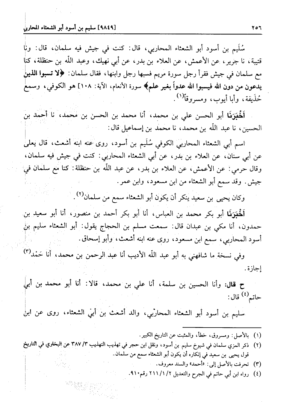 سليم بن أسود أبو الشعثاء المحاربي، قال: كنت في جيش فيه سلمان، قال: ونا قتيبة، نا جرير، عن الأعمش، عن العلاء بن بدر، عن أبي نهيك، وعبد الله بن حنظلة، كنا مع سلمان في جيش فقرأ رجل سورة مريم فسبها رجل وابنها، فقال سلمان: لا تَسُبُّوا الَّذِينَ يَدْعُونَ مِنْ دُونِ اللَّهِ فَيَسُبُّوا اللَّهَ عَدْواً بِغَيْرِ عِلْمٍ