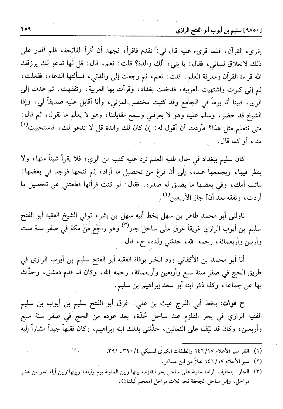 ناولني أبو محمد طاهر بن سهل بخط أبيه سهل بن بشر، توفي الشيخ الفقيه أبو الفتح سليم بن أيوب الرازي غريقا غرق على ساحل جار «3» وهو راجع من مكة في صفر سنة ست وأربين وأربعمائة، رحمه الله، حدثني ولده، ح، قال: