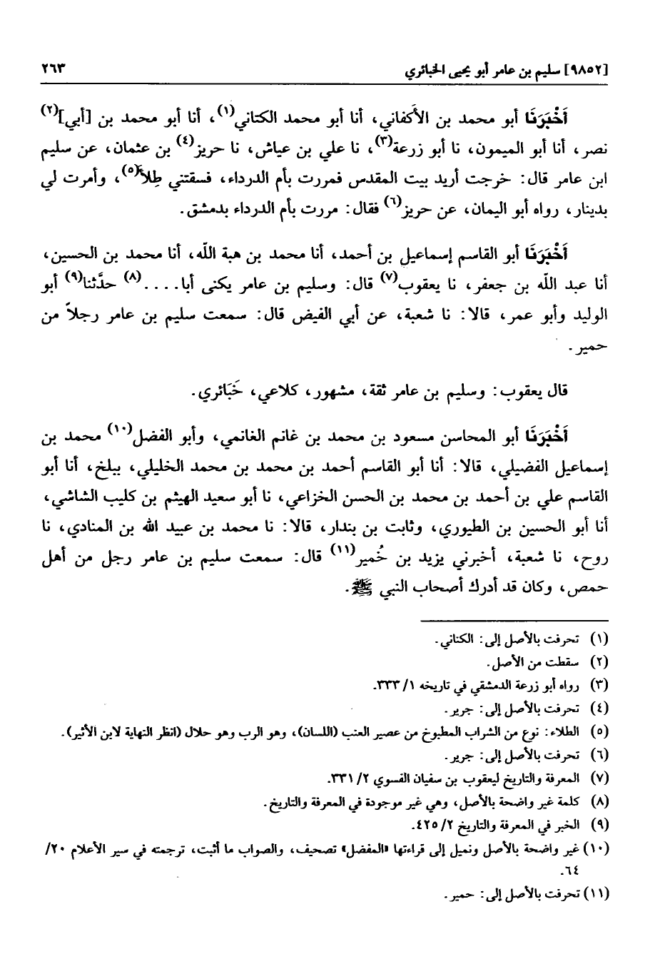 أخبرنا أبو المحاسن مسعود بن محمد بن غانم الغانمي، وأبو الفضل «10» محمد بن إسماعيل الفضيلي، قالا: أنا أبو القاسم أحمد بن محمد بن محمد الخليلي، ببلخ، أنا أبو القاسم علي بن أحمد بن محمد بن الحسن الخزاعي، نا أبو سعيد الهيثم بن كليب الشاشي، أنا أبو الحسين بن الطيوري، وثابت بن بندار، قالا: نا محمد بن عبيد الله بن المنادي، نا روح، نا شعبة، أخبرني يزيد بن خمير «11» قال: سمعت سليم بن عامر رجل من أهل حمص، وكان قد أدرك أصحاب النبي صلى الله عليه وسلم.