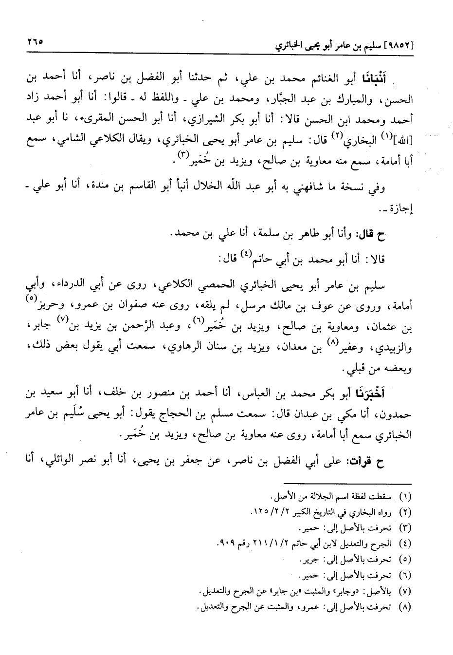 أنبأنا أبو الغنائم محمد بن علي، ثم حدثنا أبو الفضل بن ناصر، أنا أحمد بن الحسن، والمبارك بن عبد الجبّار، ومحمد بن علي- واللفظ له- قالوا: أنا أبو أحمد زاد أحمد ومحمد ابن الحسن قالا: أنا أبو بكر الشيرازي، أنا أبو الحسن المقرىء، نا أبو عبد [الله] «1» البخاري «2» قال: سليم بن عامر أبو يحيى الخبائري، ويقال الكلاعي الشامي، سمع أبا أمامة، سمع منه معاوية بن صالح، ويزيد بن خمير «3» .