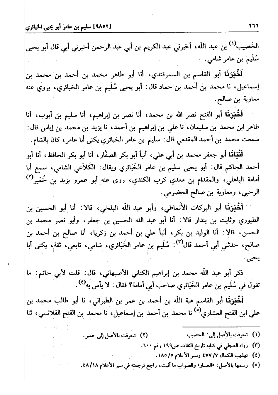 أخبرنا أبو البركات الأنماطي، وأبو عبد الله البلخي، قالا: أنا أبو الحسين بن الطيوري وثابت بن بندار قالا: أنا أبو عبد الله الحسين بن جعفر، وأبو نصر محمد بن الحسن، قالا: أنا الوليد بن بكر، أنبأ علي بن أحمد بن زكريا، أنا صالح بن أحمد بن صالح، حدثني أبي أحمد قال «3» : سليم بن عامر الخبائري، شامي، تابعي، ثقة، يكنى أبا يحيى.