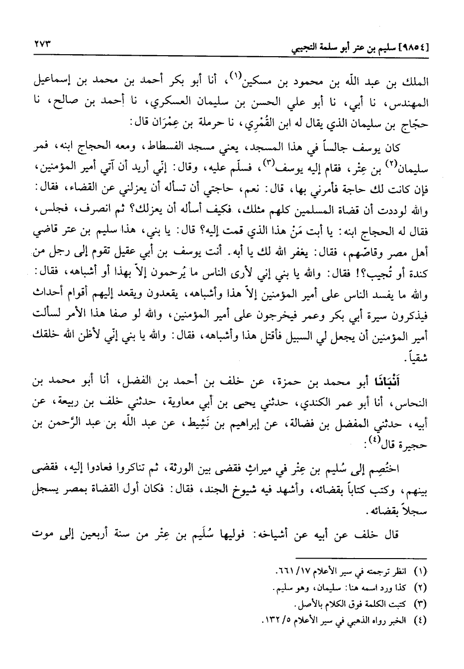 أنبأنا أبو محمد بن حمزة، عن خلف بن أحمد بن الفضل، أنا أبو محمد بن النحاس، أنا أبو عمر الكندي، حدثني يحيى بن أبي معاوية، حدثني خلف بن ربيعة، عن أبيه، حدثني المفضل بن فضالة، عن إبراهيم بن نشيط، عن عبد الله بن عبد الرّحمن بن حجيرة قال «4» :