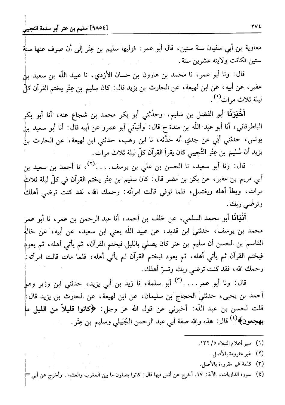 أخبرنا أبو الفضل بن سليم، وحدّثني أبو بكر محمد بن شجاع عنه، أنا أبو بكر الباطرقاني، أنا أبو عبد الله بن مندة ح قال: وأنبأني أبو عمرو عن أبيه قال: أنا أبو سعيد بن يونس، حدثني أبي عن جدي أنه حدّثه، نا ابن وهب، حدثني ابن لهيعة، عن الحارث بن يزيد أن سليم بن عتر التّجيبي كان يقرأ القرآن كلّ ليلة ثلاث مرات.