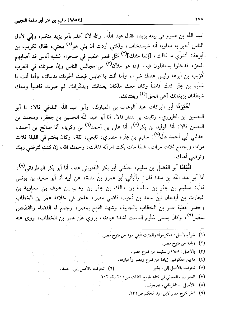 أنبأنا أبو الفضل بن سليم، حدّثني أبو بكر اللفتواني عنه، أنا أبو بكر الباطرقاني «8» ، أنا أبو عبد الله بن مندة قال: وأنبأني أبو عمرو بن مندة، عن أبيه أنا أبو سعيد بن يونس قال: سليم بن عتر بن سلمة بن مالك بن عتر بن وهب بن عوف بن معاوية بن الحارث بن أيدعان ابن سعد بن تجيب قاضي مصر، هاجر في خلافة عمر بن الخطاب وحضر خطبة عمر بن الخطاب بالجابية، وشهد الفتح بمصر، وجمع له القضاء والقصص بمصر «9» ، وكان يسمى سليم الناسك لشدة عبادته، يروي عنعمر بن الخطاب، روى عنه