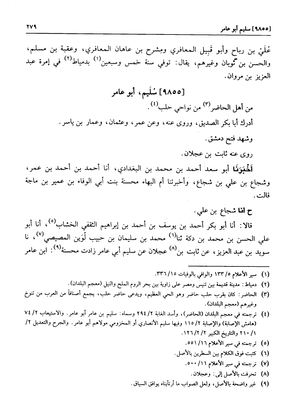 قالا: أنا أبو بكر أحمد بن يوسف بن أحمد بن إبراهيم الثقفي الخشاب «5» ، أنا أبو علي الحسن بن محمد بن دكة ثنا «6» محمد بن سليمان بن حبيب لوين المصيصي «7» ، نا سويد بن عبد العزيز، عن ثابت بن «8» عجلان عن سليم أبي عامر زادت محسنة «9» : ابن عامر